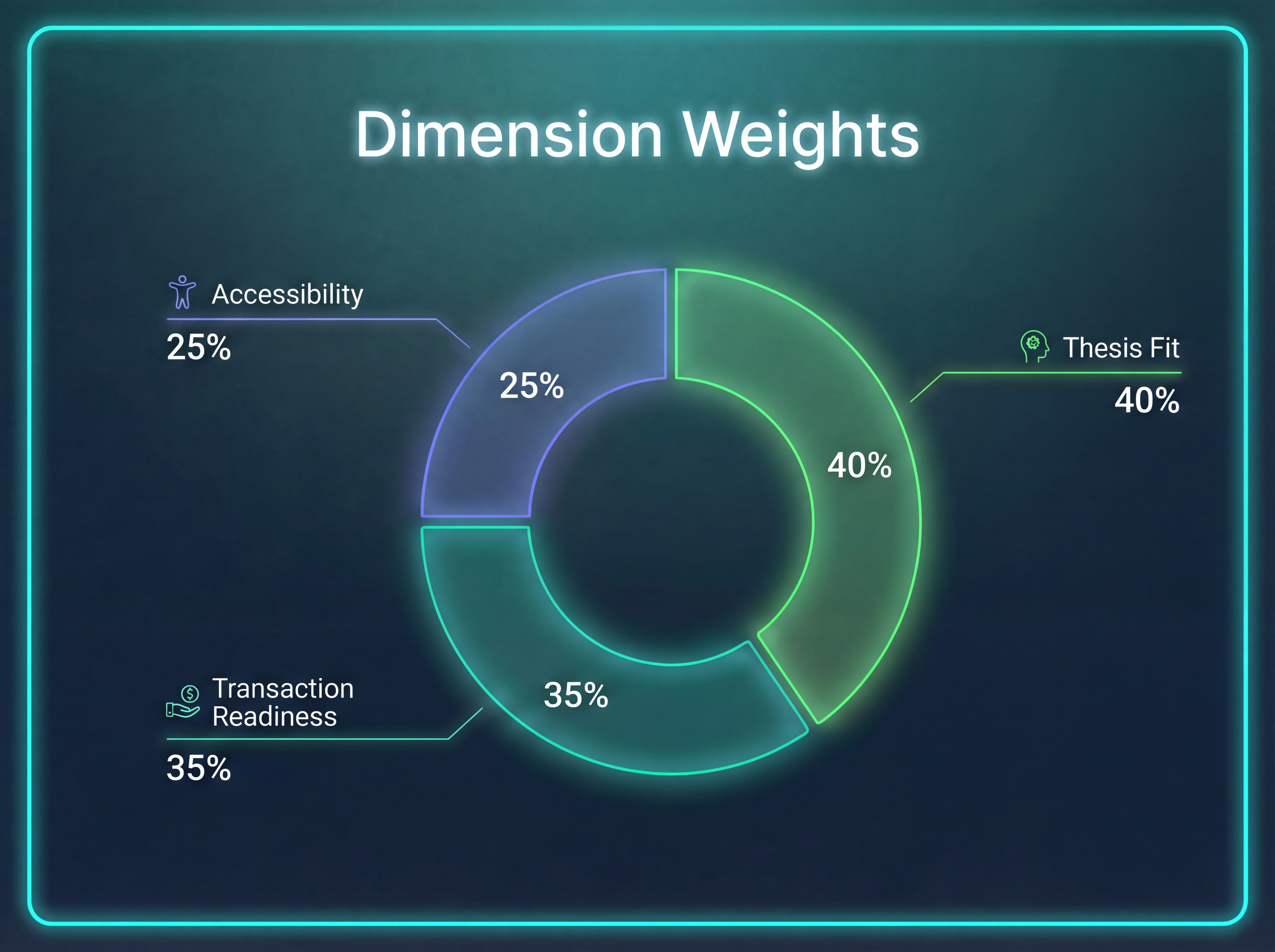 Every target receives a Dealflow Score (0-100) based on three weighted dimensions: