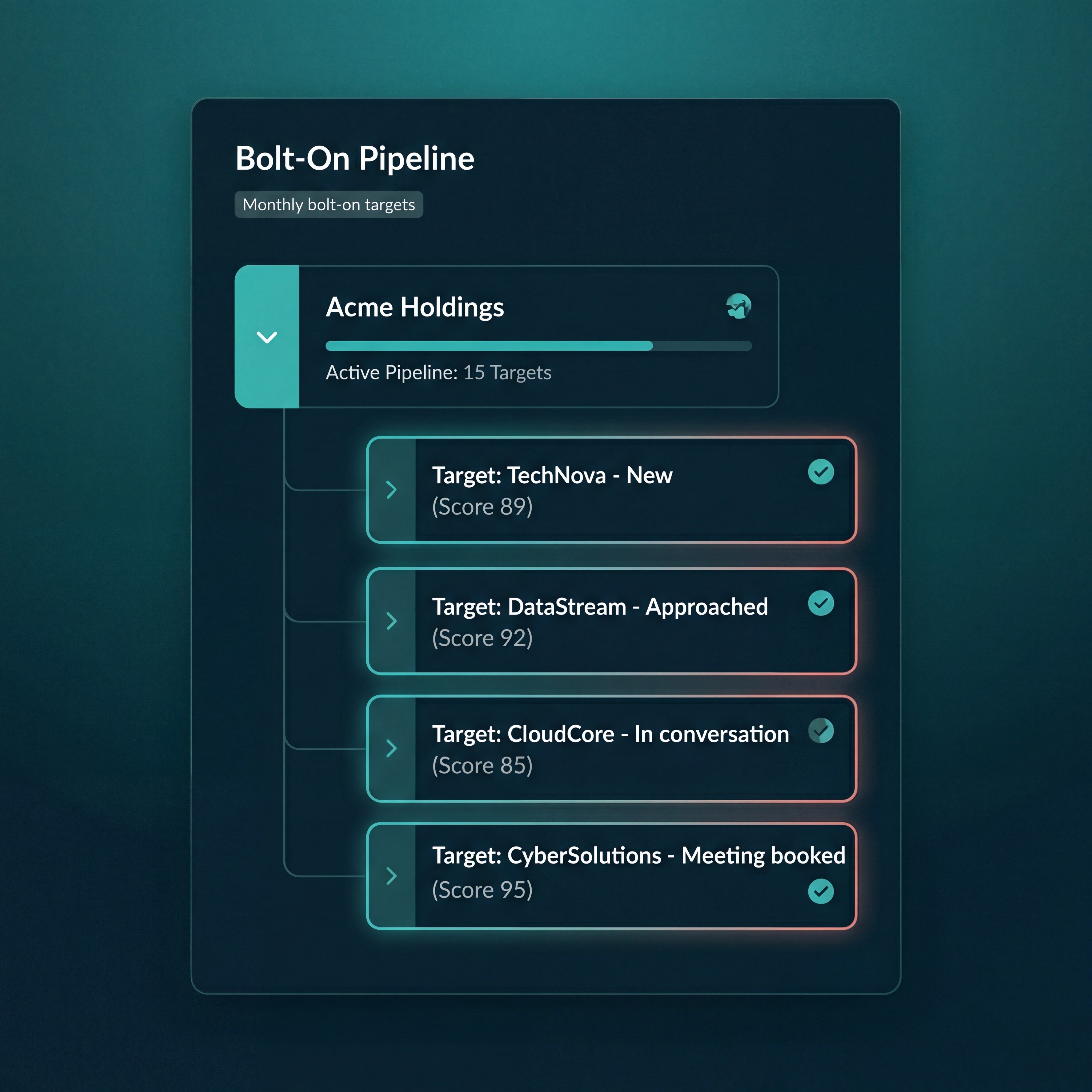 Not every company that fits your criteria is ready to transact. Our proprietary Dealflow Score analyses ownership age, succession signals, advisor engagement status, and transaction timing indicators to surface companies most likely to engage now—not in five years. You only see targets scoring 70+.